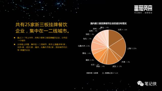 整个餐饮的新三板,主要上市城市是北京、上海、武汉主流城市,其他城市相对较少。这25家中西式快餐和中式正餐是主要品类,其次是火锅,分别占34%、23%、15%。