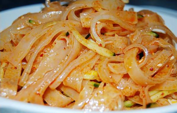 陕西的风味小吃中,“凉皮”是最受欢迎的品种之一,男女老少爱吃,尤受年轻姑娘欢迎,一年四季都有卖,夏天吃的人更多。西安的大街小巷,陕西的每个城镇,乃至乡村,到处都有卖凉皮的。一张桌子,几个小板凳,就是一个凉皮摊,只要有卖的,就有人吃,凉皮以其棉软润滑,酸辣可口,爽口开胃,不但是街头小吃,而且登上大雅之堂。在陕西各大饭店、饭庄、酒楼经营的陕西风味小吃和陕西风味小吃宴中,凉皮是必不可少的。