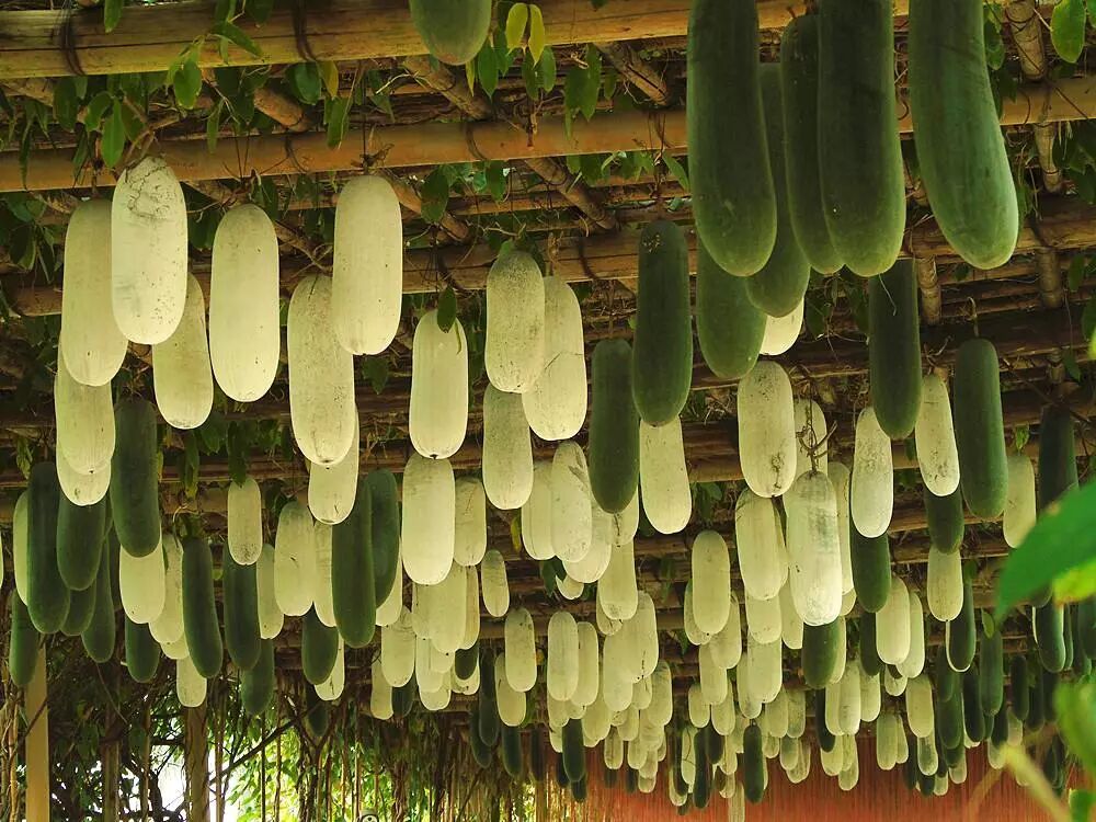 长廊两旁种植了珠帘、老鼠瓜、蒲瓜、千成兵丹、丝 瓜、水瓜、蜜本南瓜、长柄葫芦、西番莲、刀豆等一批观赏性强、长势旺盛的瓜果,形成长型、圆型、纺锤型、葫芦型等形态各异的多果型结合。