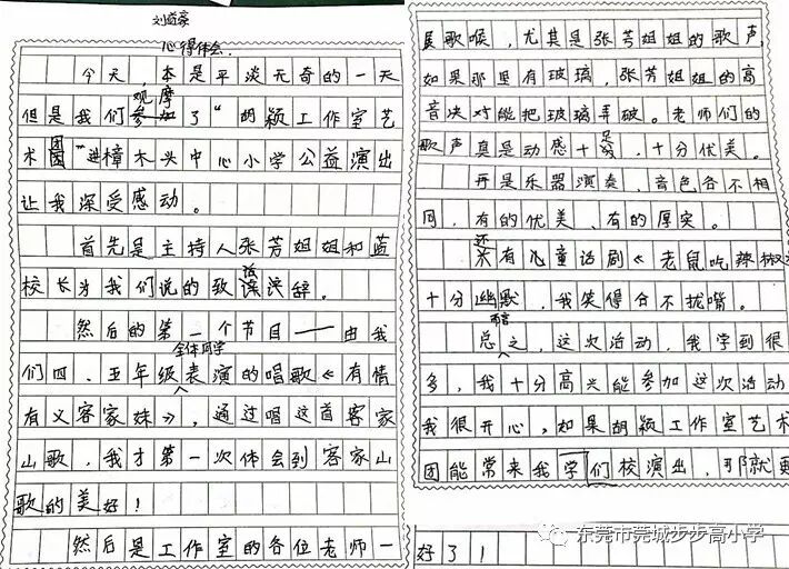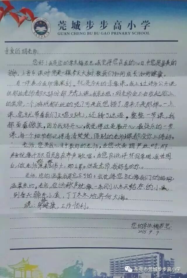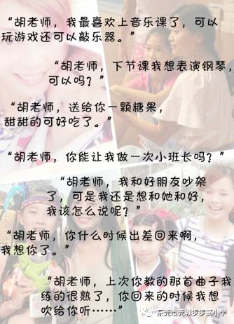 “老师您是一个不会骂人而跟我们讲道理的,您教我们葫芦丝时很耐心。我觉得老师很美丽,我喜欢胡老师的白牙齿、会说话的眼睛、甜甜的微笑……胡老师您跳的舞好美哦!”
