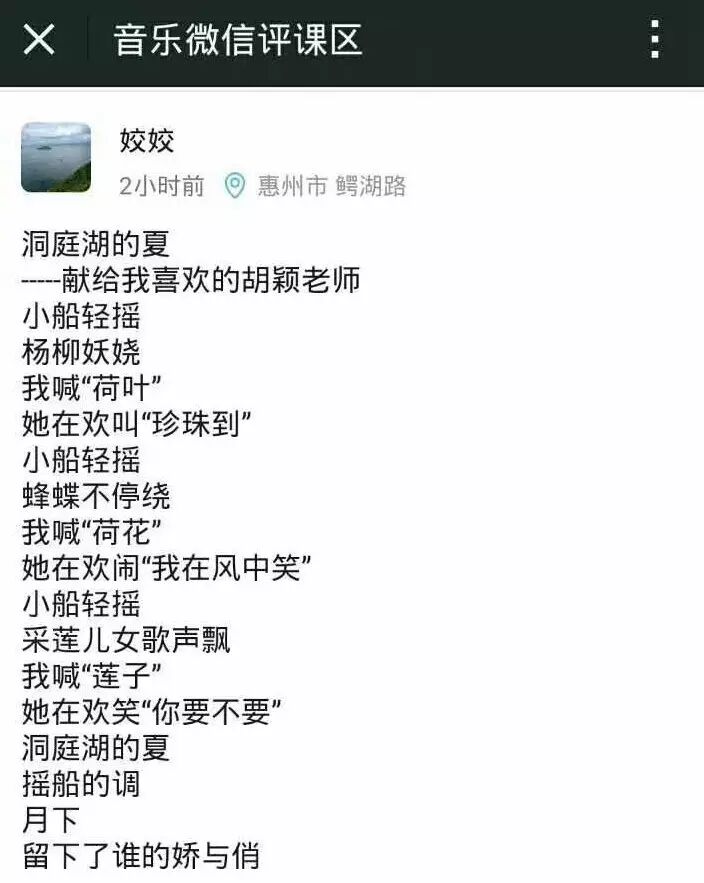 2015年10月,在全国中小学音乐名师高效课堂教学研讨会后,一位听课教师写下了一首《洞庭湖的夏》——“献给我最喜爱的胡颖老师”。