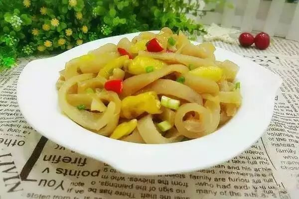 1、炸猪皮提前泡发,并用清水浸泡至紧致有弹性,切成细条。