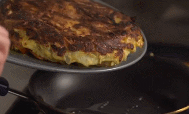 待土豆洋葱混合蛋浆大部分凝固后利用空盘子翻转。