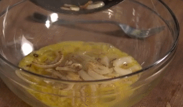 5.把鸡蛋打散后,放入沥干的土豆、洋葱、盐和黑胡椒,轻微搅拌后浸泡大约5分钟。