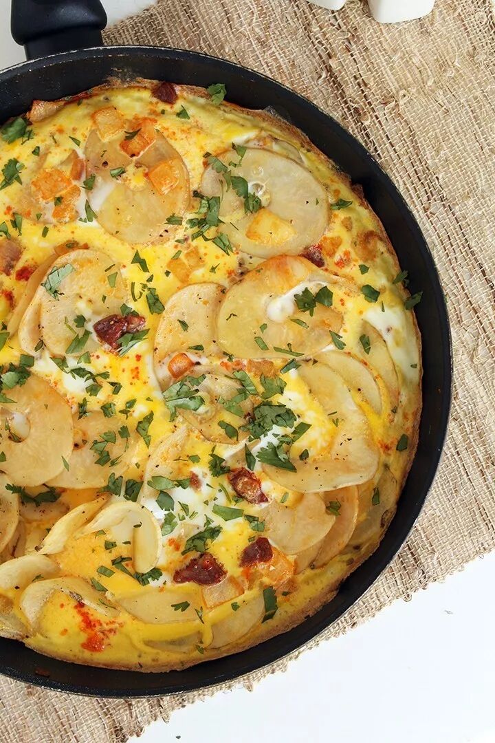 西班牙煎蛋饼的食材是每个家庭最常见的鸡蛋和土豆,首先以油炸的方式把土豆煮软,然后加入蛋浆混合后放入平底锅煎成蛋饼。传统版本是只有鸡蛋和土豆,但后来有些地方按照其土豆的品种影响,会在混合时加一些洋葱来丰富口感和味觉。