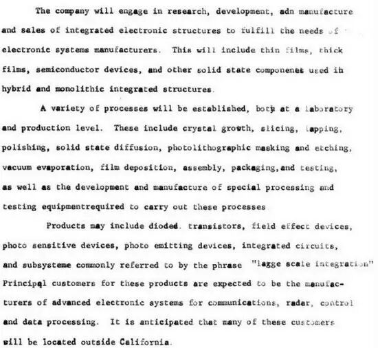 产品也许包括二极管晶体管、场效应设备、光感设备、发光设备、集成电路以及通常被称作“大尺度整合”的子系统。预计这些产品的主要客户是通信、雷达、控制和数据处理领域的高级电子系统厂商。预计许多客户将来自加州以外的地区……多年以后,Intel所持观点是随着移动端处理器复杂性的增加,改变已经降临——但到目前为止(加上可预见的将来),市场选择了另一种商业模式。