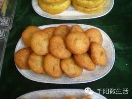 油糕是千阳地比较常见的一种特色小吃,是使用油炸的一种糕点,呈椭圆形状,馅一般是红糖或者白糖,油糕吃起来既甜又软绵,陕北民歌《山丹丹花开红艳艳》中对此就有生动的描述。油糕色泽金黄,细腻柔软,经久而不变色不变质,属纯天然绿色食品。