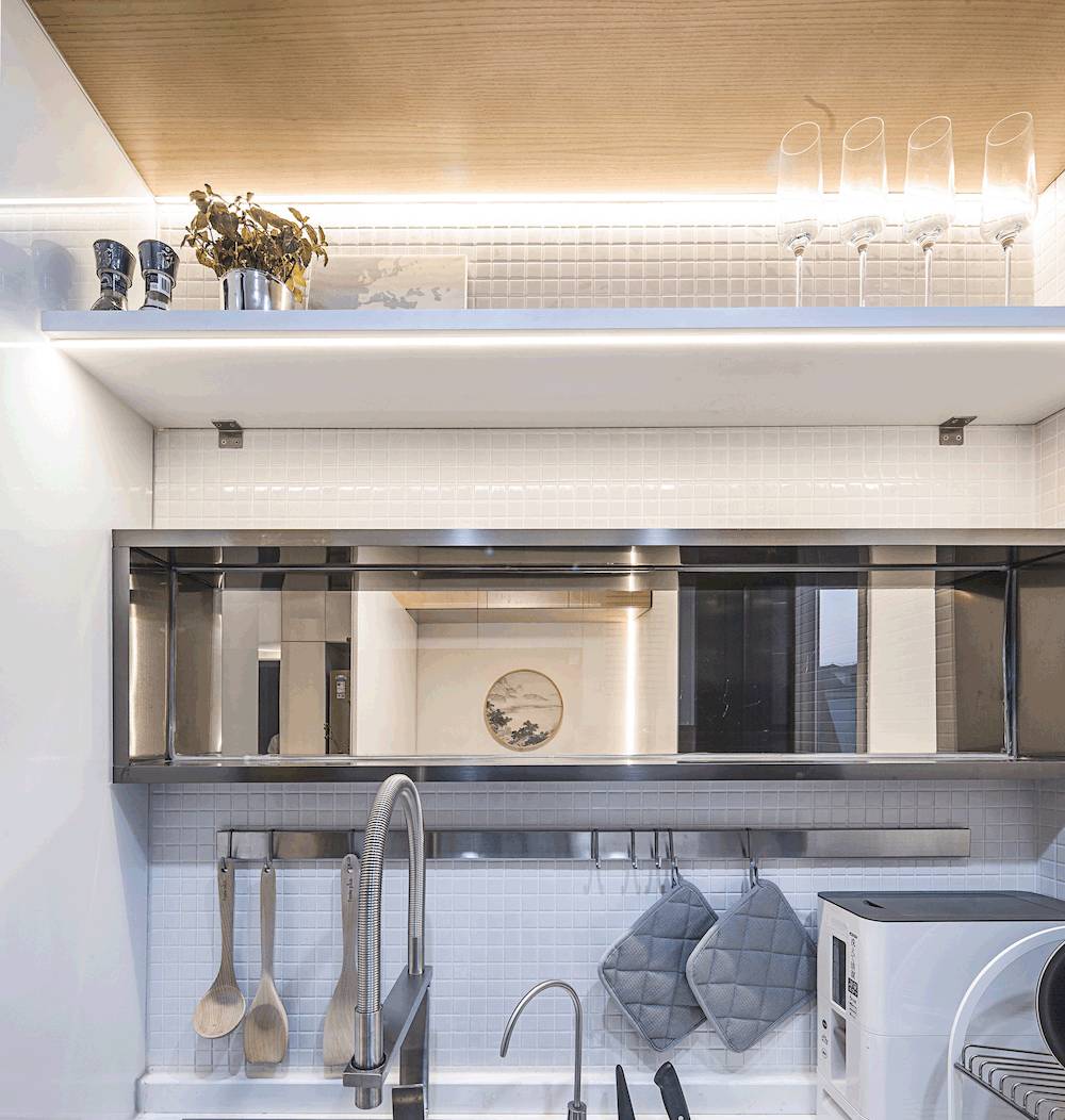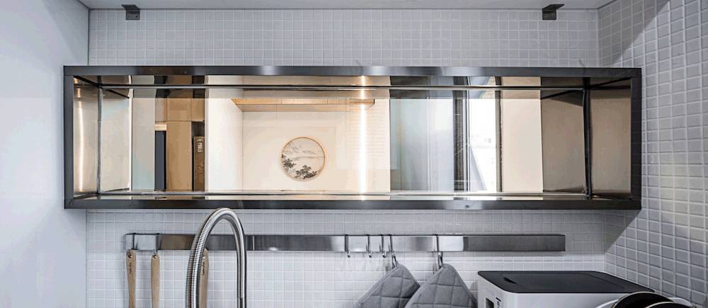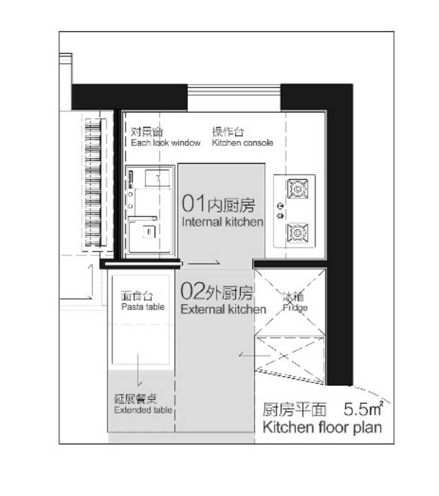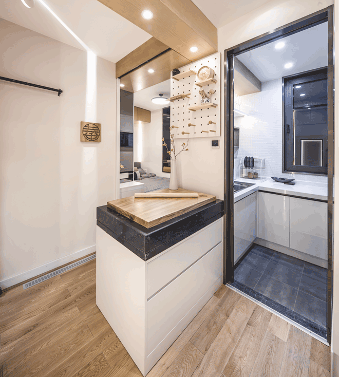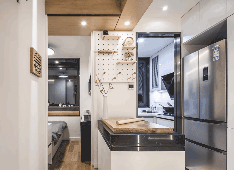 除此之外,在如此小的空间内,设计师居然还变魔术似的设计出内外两个厨房,内厨房可以烹饪各种中式菜肴,也可以满足秦太太烤各种小点心的小小梦想(透明玻璃移门隔绝油烟),而外厨房则是一个面食操作和临时餐厅混用的区域,爷爷奶奶可以在这里做裤带面、搓鱼子、饸烙面、锅盔等各种面食啦(哎呀呀,小编写的都要流口水啦)。
