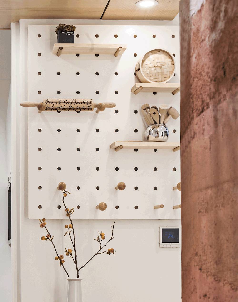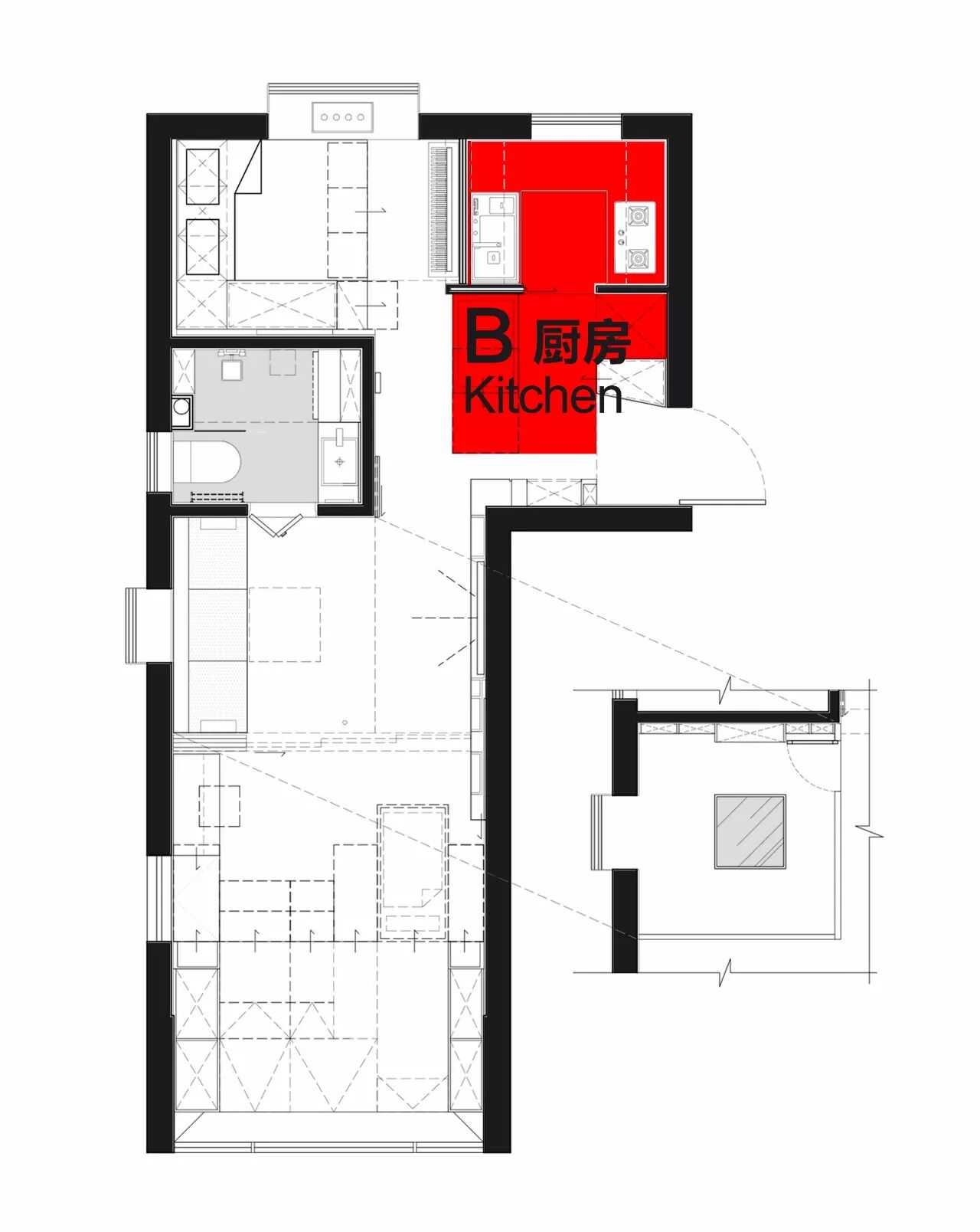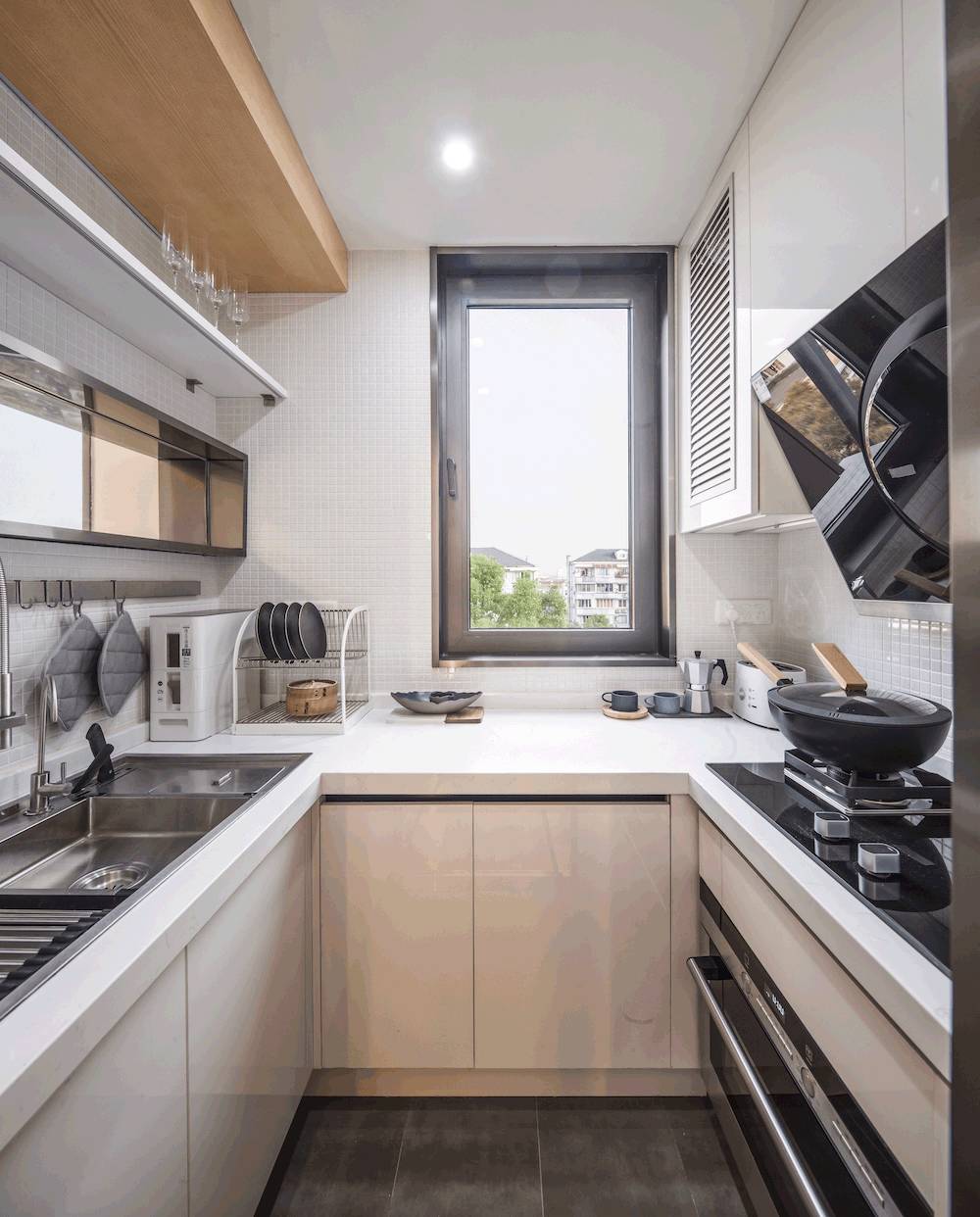 除此之外,在如此小的空间内,设计师居然还变魔术似的设计出内外两个厨房,内厨房可以烹饪各种中式菜肴,也可以满足秦太太烤各种小点心的小小梦想(透明玻璃移门隔绝油烟),而外厨房则是一个面食操作和临时餐厅混用的区域,爷爷奶奶可以在这里做裤带面、搓鱼子、饸烙面、锅盔等各种面食啦(哎呀呀,小编写的都要流口水啦)。