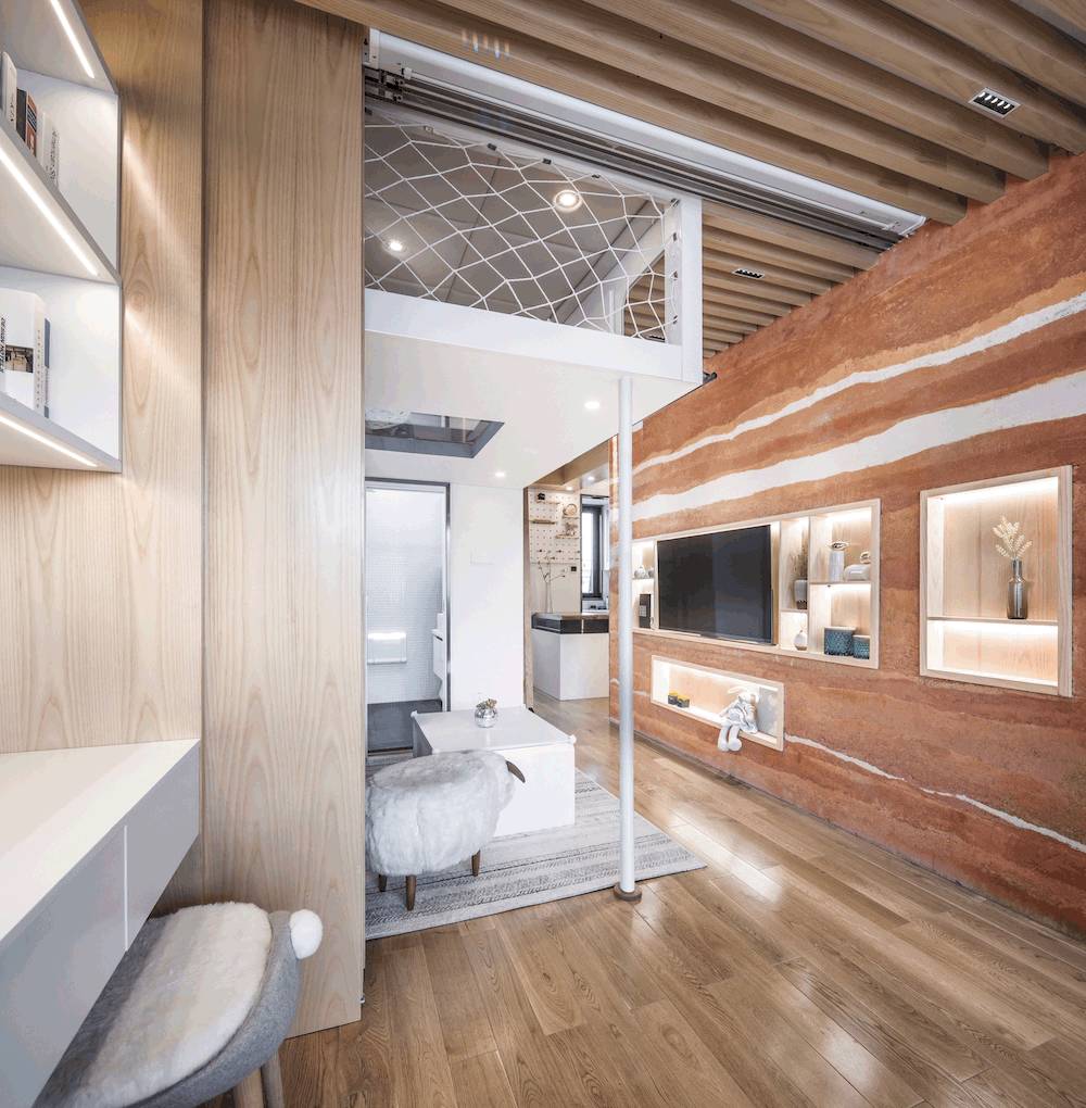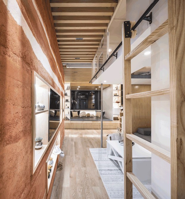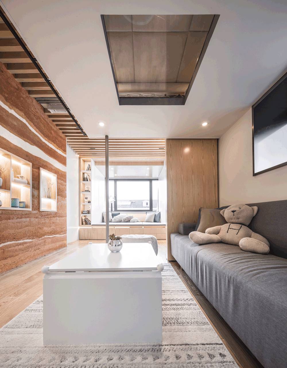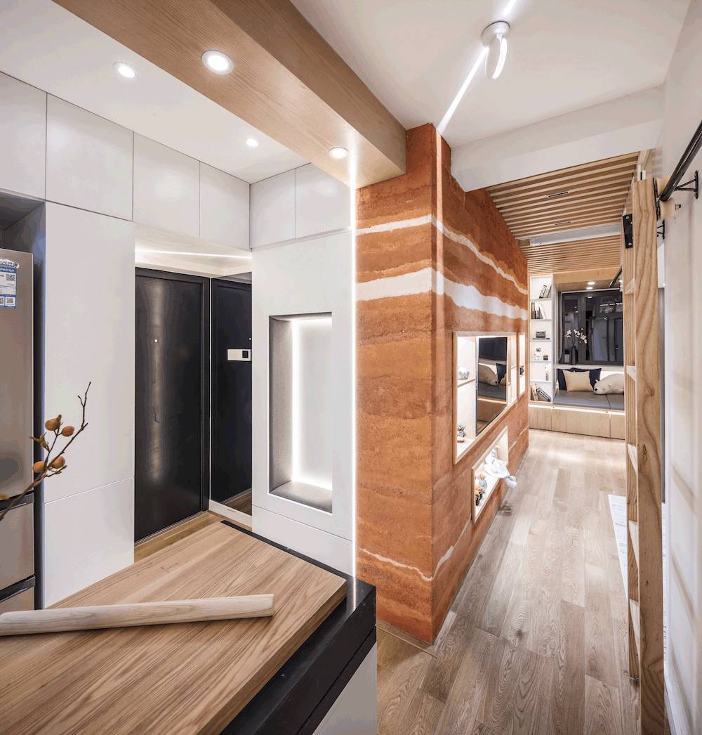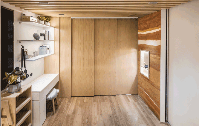 客厅+主卧对面还有连续的夯土墙,这个夯土墙做成了张掖丹霞地貌的样子。你以为这个墙就是为了好看么?NO!NO!NO!图样图森破啦。首先,夯土材质具备完美的吸引效果,能够解决委托人一家和邻居的隔音问题,不仅不会再像之前一样互相影响,而且就算爷爷奶奶放声高歌,米宝动情哭泣都没问题啦;然后,设计师在这里做了一个特别的设计,入口处夯土墙转角做了非常非常厚的假象,然额实际上客厅部分的夯土墙仅0.15米厚(设计师:哼,一分一厘的空间都不浪费),在这么薄的夯土墙里,设计师居然还嵌下了一面可移动镜子,使主卧的白墙可以在涂鸦模式(米宝画画)和镜子模式(瑜伽、健身、舞蹈)之间灵活切换。
