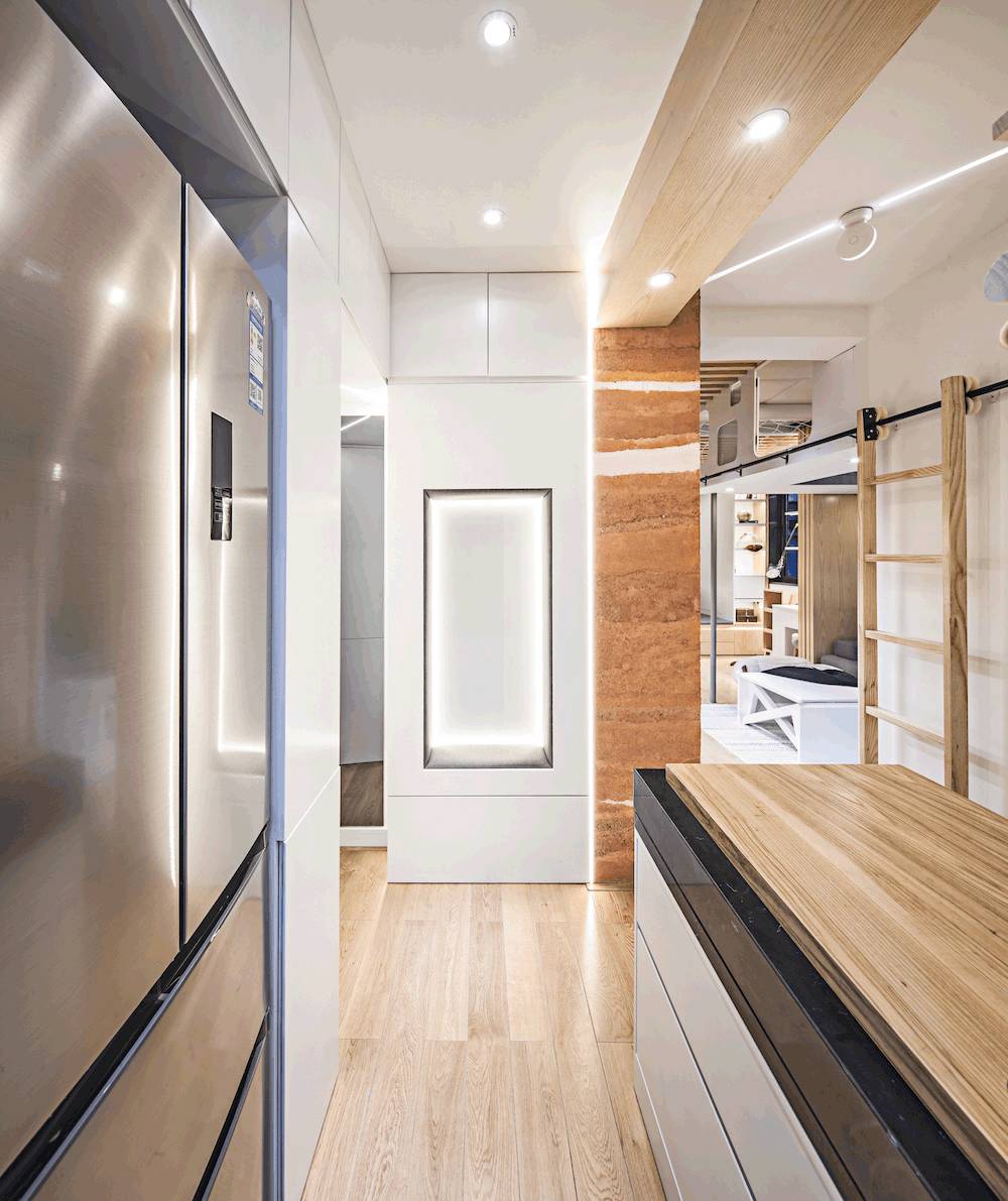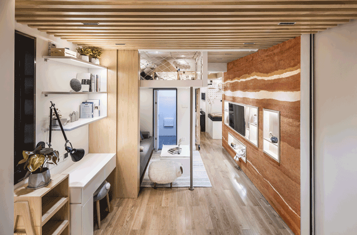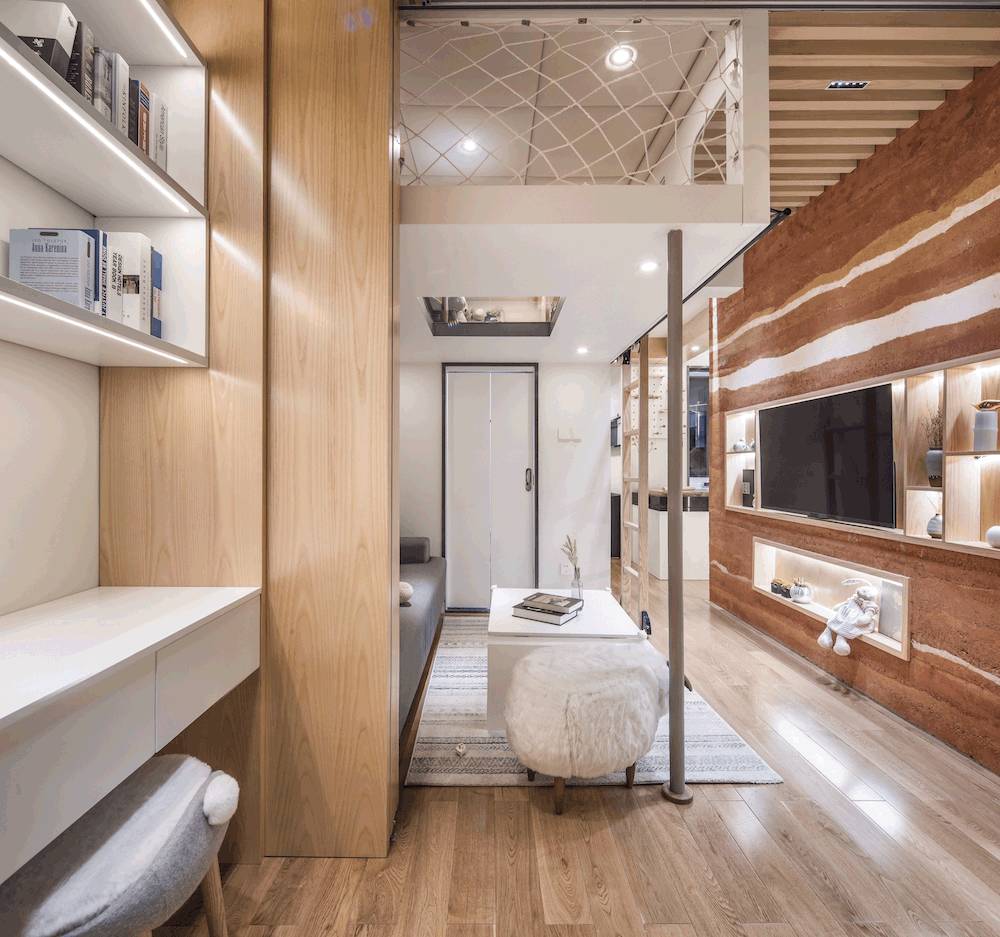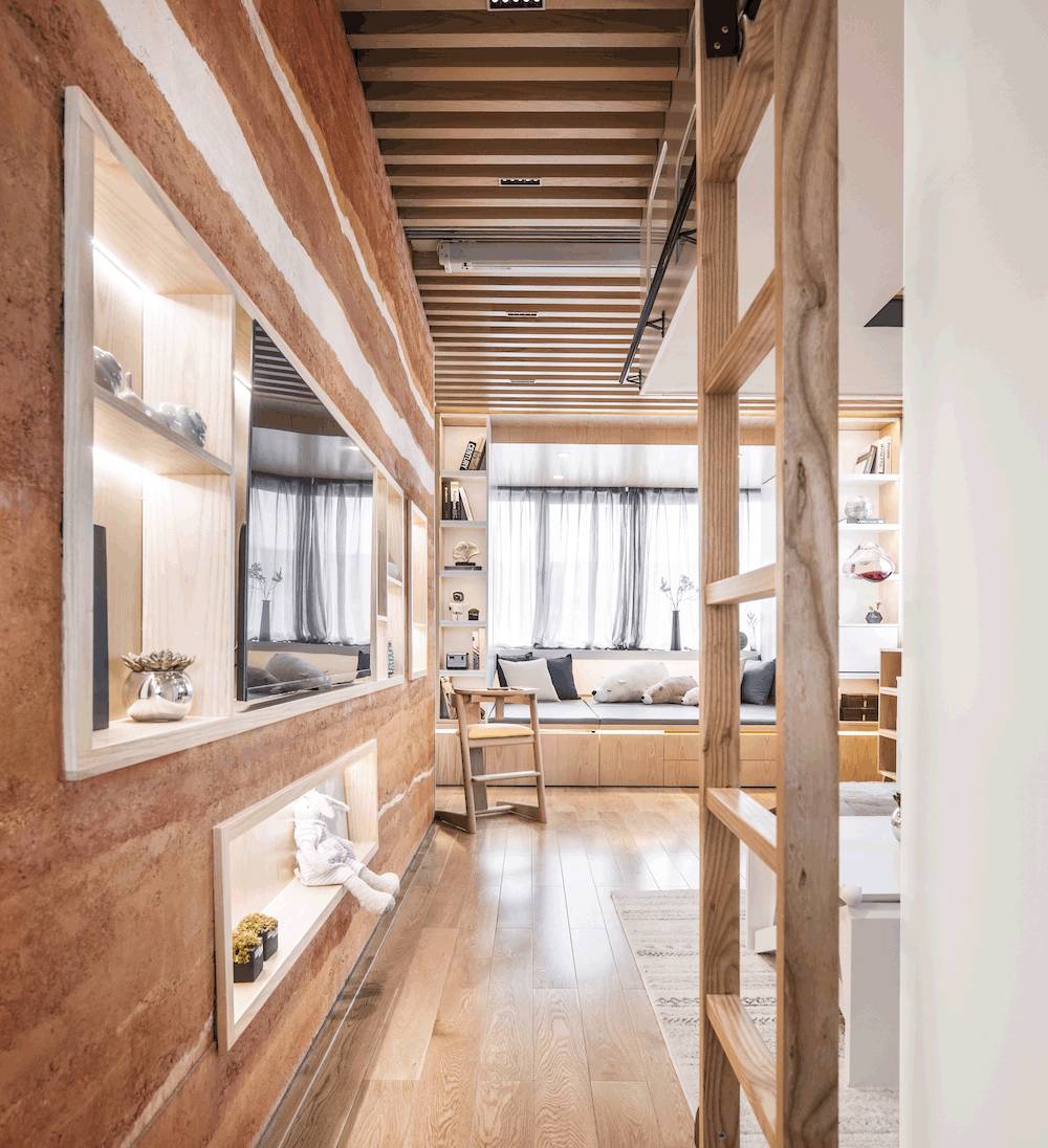 客厅+主卧对面还有连续的夯土墙,这个夯土墙做成了张掖丹霞地貌的样子。你以为这个墙就是为了好看么?NO!NO!NO!图样图森破啦。首先,夯土材质具备完美的吸引效果,能够解决委托人一家和邻居的隔音问题,不仅不会再像之前一样互相影响,而且就算爷爷奶奶放声高歌,米宝动情哭泣都没问题啦;然后,设计师在这里做了一个特别的设计,入口处夯土墙转角做了非常非常厚的假象,然额实际上客厅部分的夯土墙仅0.15米厚(设计师:哼,一分一厘的空间都不浪费),在这么薄的夯土墙里,设计师居然还嵌下了一面可移动镜子,使主卧的白墙可以在涂鸦模式(米宝画画)和镜子模式(瑜伽、健身、舞蹈)之间灵活切换。