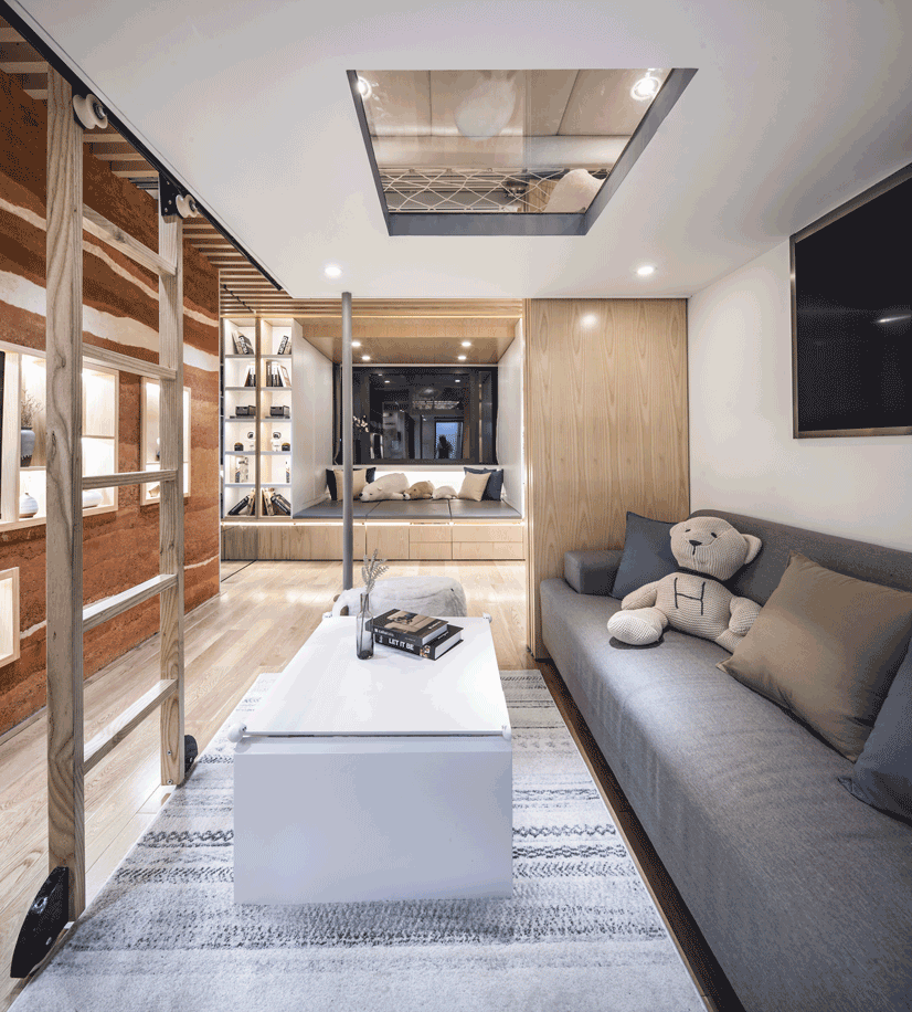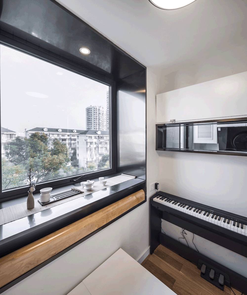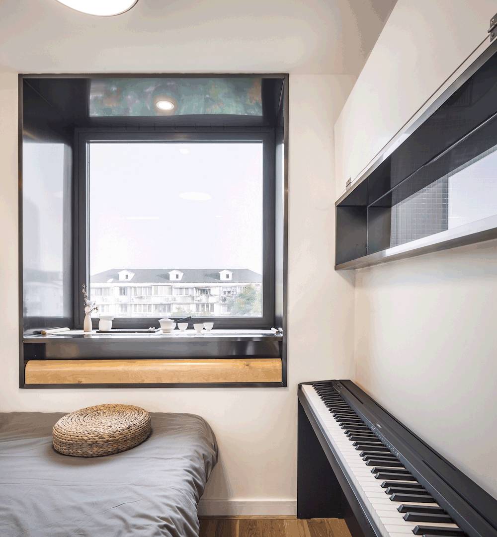更妙的是,设计师在老人房和厨房之间设计了一个水平的窗,白天打开时,不仅使家庭空间更为通透,卧室弹琴的奶奶和厨房做饭的爷爷(这家一直是爷爷做饭)可以相互对望(照看),琴棋书画和柴米油盐相和,想想都浪漫到了极点,啊啊啊,我的小心心!而晚上翻下老人房的横窗盖板,则可以完整的保护老人房的隐私。