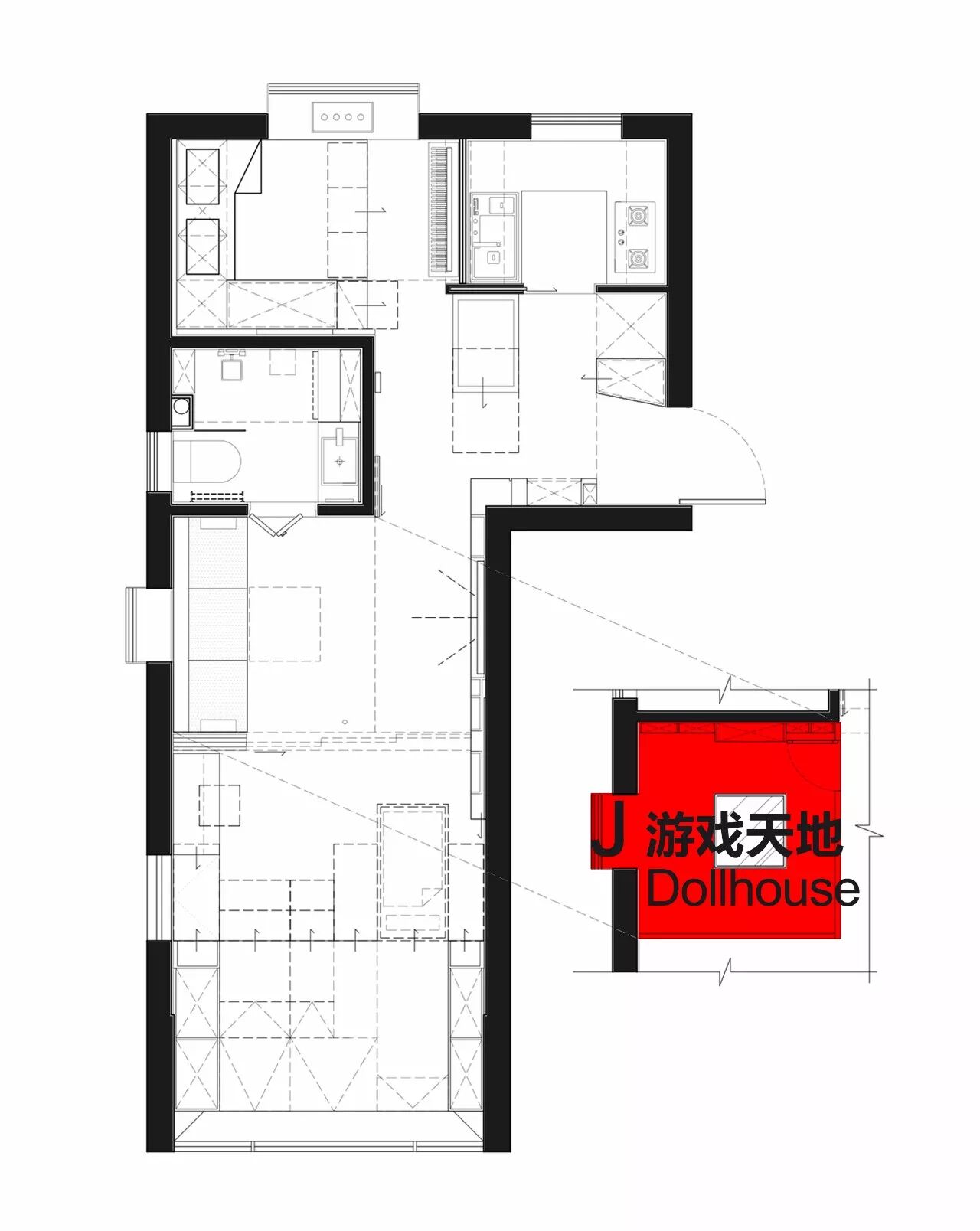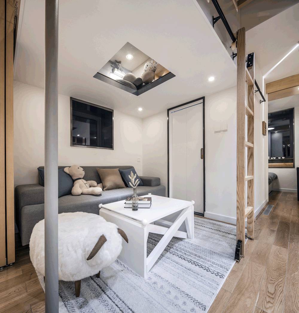 夹层:由于下方沙发、餐桌区域大多数的使用方式为坐着,因而设计的时候根据身高设计了**的合理高度,日常通过的时候并不感到压抑。而客厅上方尽可能地利用有限的垂直空间为米宝设计了一个温馨可爱的玩耍区。设计上超薄的钢结构体现了对空间的毫厘必争,超大玻璃的设计使得在上方爬行、玩耍的小米宝和家人有趣的互动(玻璃强度完全够,承重四五个成年人没问题),玩耍区完全锁和防护网的设计确保了小宝贝安全上的万无一失。设计师贴心地为米宝准备了炒鸡多的玩偶和绘本,委托人在工作和作饭的时候可以把米宝“寄存”在玩耍区一会会,也可以陪米宝一起阅读、游戏。等米宝再长大到可以独立睡觉的时候,这里将是她独立的小天地。