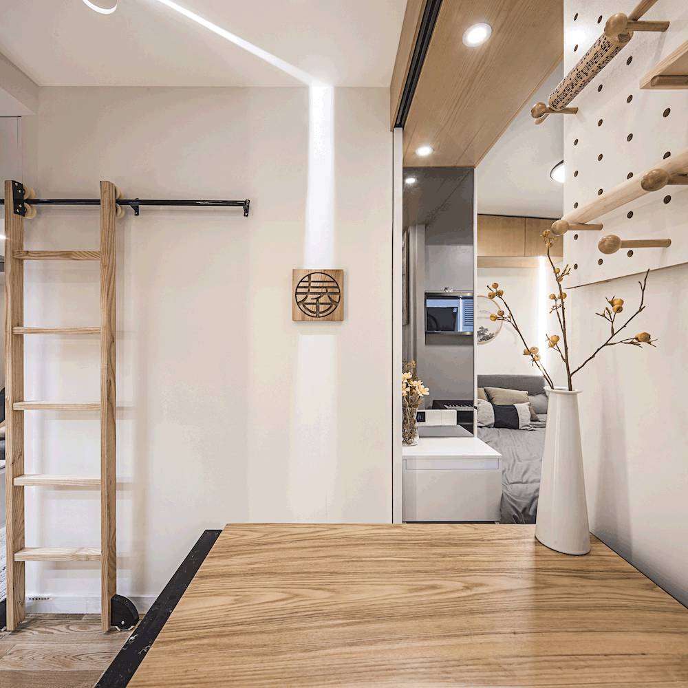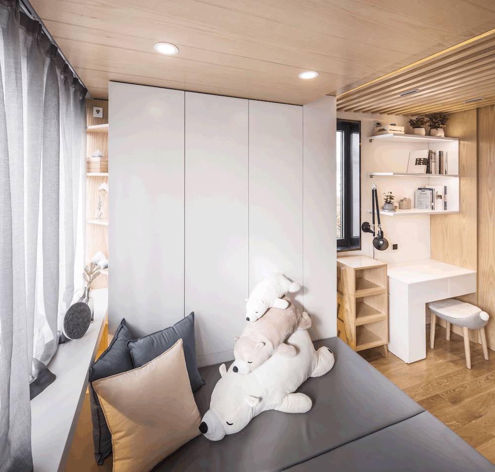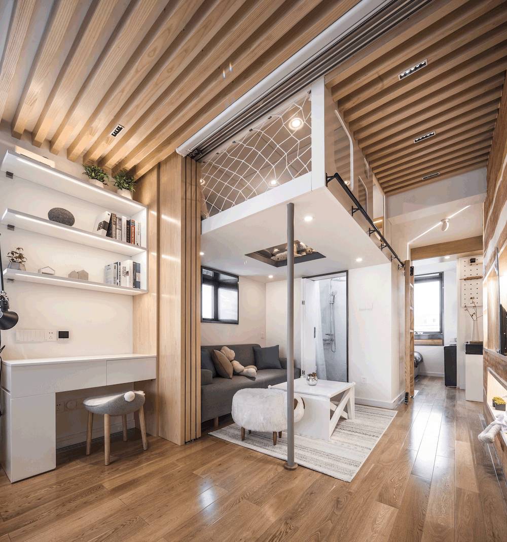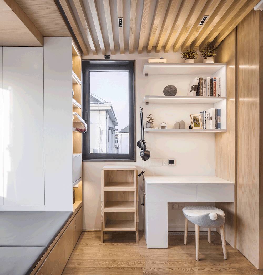 设计师说,要有独立的隐私空间。白天一直到家人一起吃完晚饭,这个家是无比通透流动的,三面采光使这个家可以一直沐浴在阳光下,虽然只有三十多平,但也足够小米宝打开奔跑模式啦!而在晚上需要休息或者工作的时候,设计师设计的移动隔墙则可以把老人卧和父母卧完全独立开来,留在中间是小客厅和卫生间。更为神奇的是,能够隔声并且超级厚重的实木移动隔墙,在拉动的时候居然如丝般顺滑(谁拉谁知道)。小编不由得惊叹,科学技术是第一生产力啊!!!更为贴心的是,设计师在两个卧室中分别为媳妇婆婆设计了独立的化妆台。