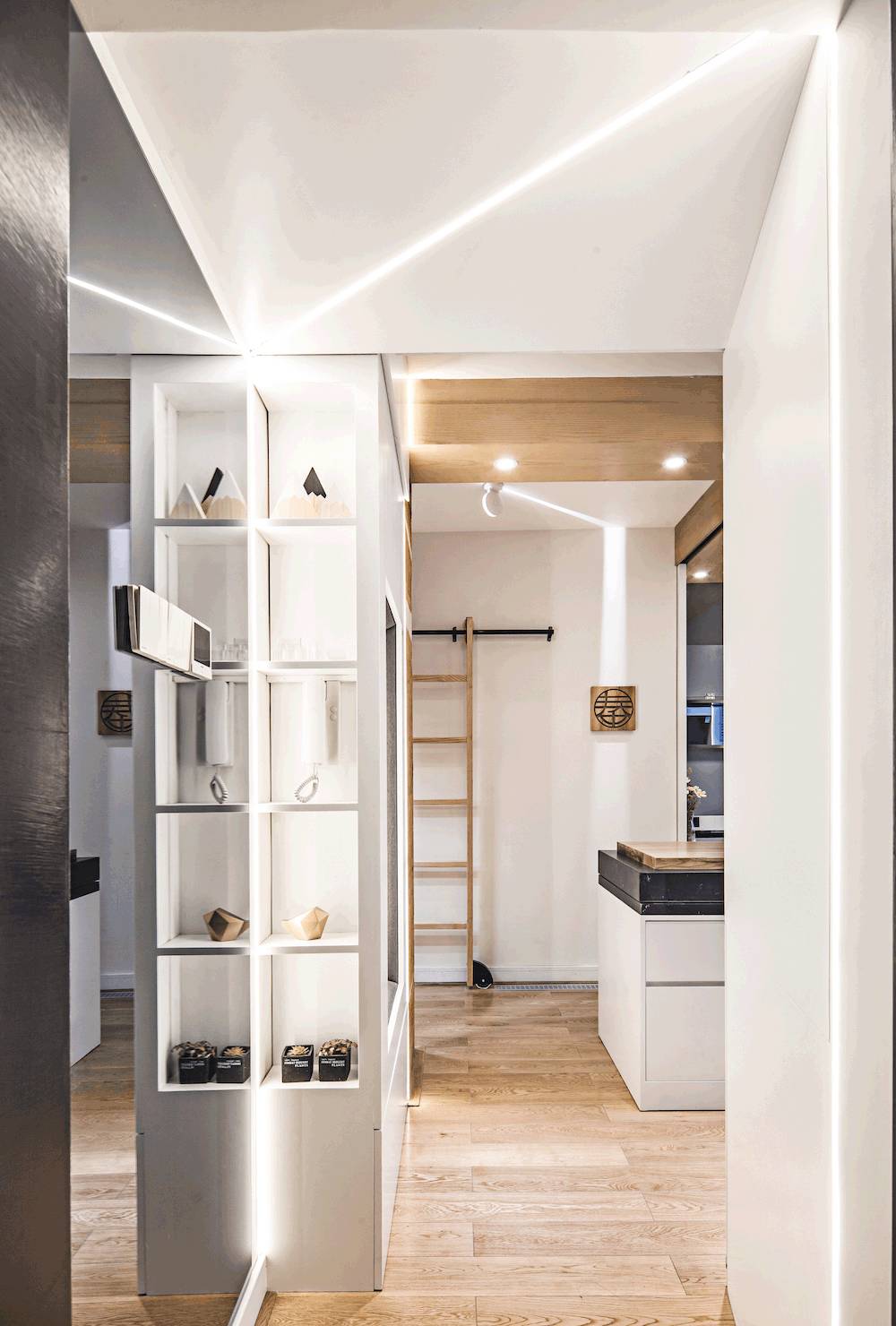 入口:走过狭长的共用走道,刚进门的入口相比于原先反倒做了压缩,是一种欲扬先抑的铺垫。连续的线性灯带勾勒出一道富有仪式感的光的门,沐光而入,扑面而来的就是层叠深远的“翠玲珑”。除了视觉上的经验之外,这个压缩也为这个家增加了恰到好处的储藏空间,壁龛“换鞋凳”轻巧实用,还可以在未来相当长的时间内成为米宝看爷爷做饭的迷你沙发。