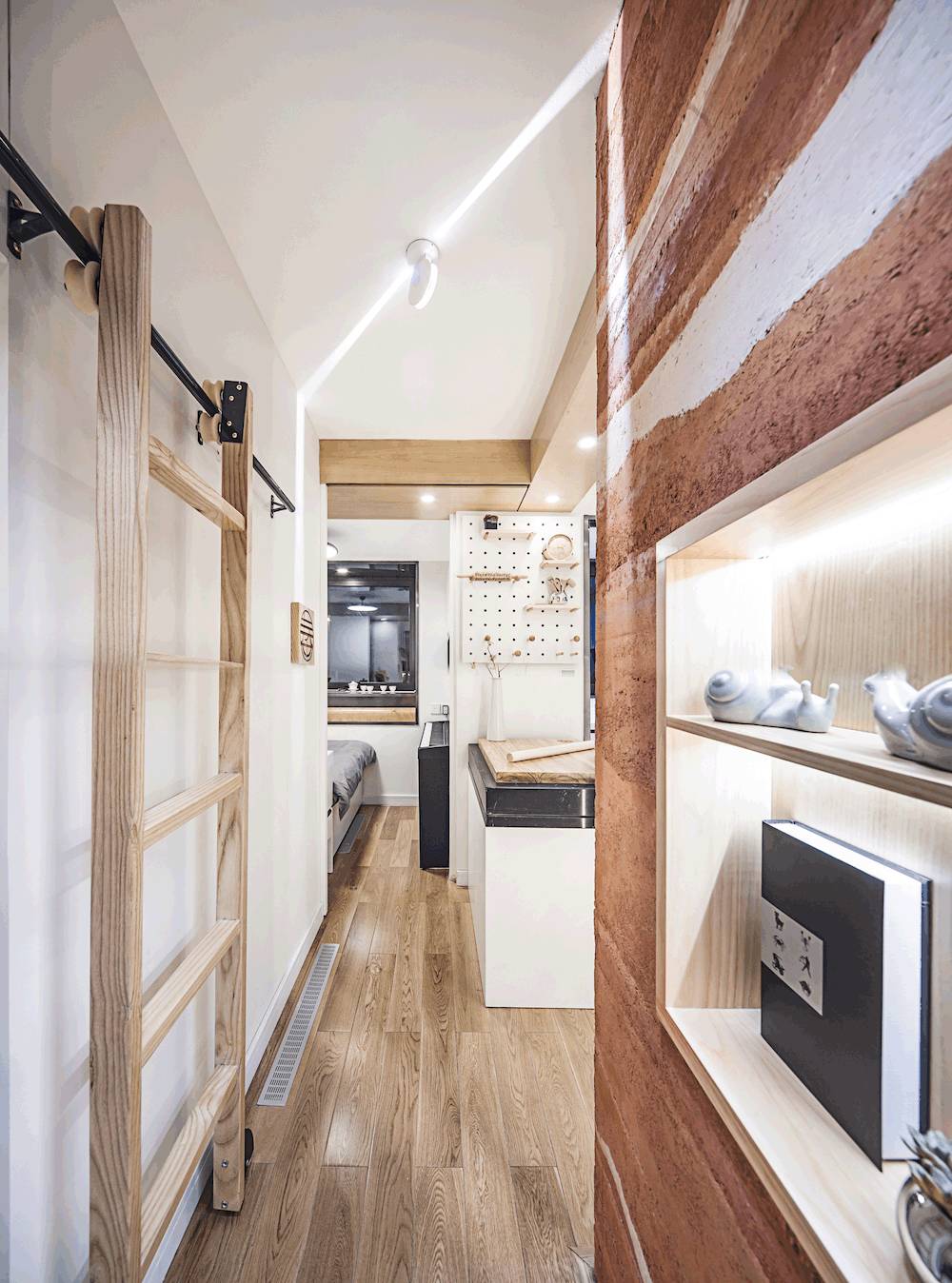 两处“翠玲珑”打破了原先家中各个小空间的隔阂,户型短边方向狭小闭塞的先天不足被巧妙化解。除此之外,家里的储物空间在增加的同时,完全不影响所有窗户的采光!斜向空间的利用不占用室内的宝贵墙面,节省的墙面地面被复合利用成储藏空间,总计达到22㎡,占室内总面积的65%