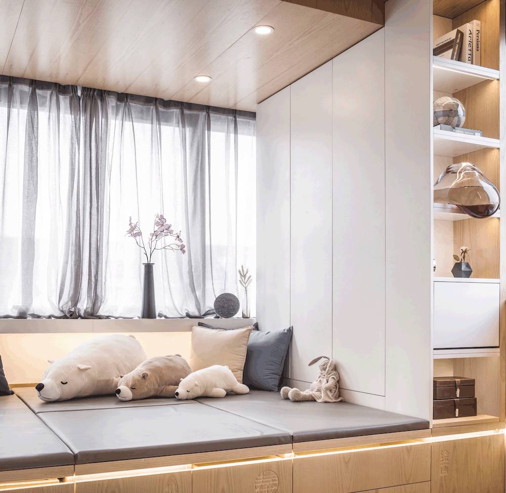 老人房:老人房将空间利用到了极致,这是一个卧室+茶室+琴房的合体。奶奶的梳妆台和梳妆凳在入口处,方便实用;床下、柜中是设计合理的收纳空间;超大飘窗为爷爷奶奶提供了茶台;床下还可以推出奶奶的琴凳,两个琴凳的设计让四手联弹也成为了可能。