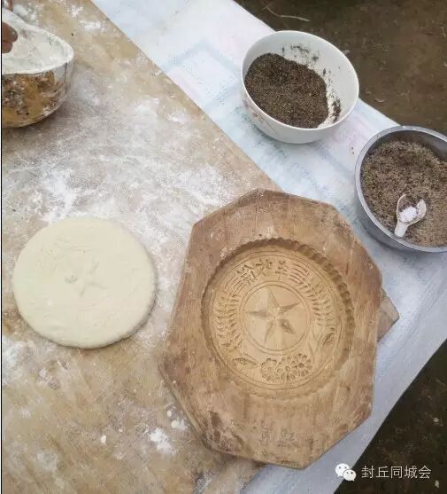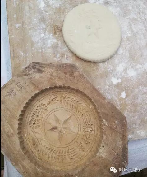 2. 将发好的白面包入馅料,然后就是最主要的一步,放入爷爷年轻时亲手自制的锅盔模具当中,整形,爷爷做了一辈子木工,心灵手巧,制作这个模具可是要非常精巧的构思和精确的制作,听爷爷说那个时候是文化革命时期,制作的东西不能带有龙凤等老旧思想,那就要和传统的区别开来,把五角星放在中间是明智之举,旁边放有麦穗和花朵。