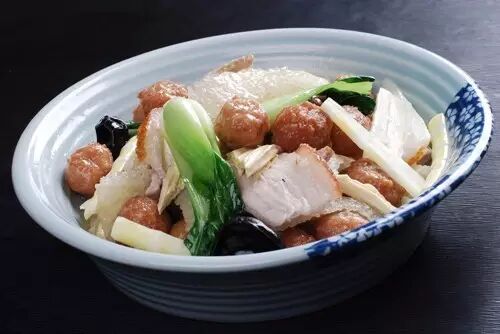 介绍:烧三鲜是一道很有陕西特色的招牌菜,也是一道适合冬季食用的家常菜。主要原料有:肉丸、鱼肚、烧肉、小青菜、花菇等,荤素搭配,入口滑嫩,老少皆宜。