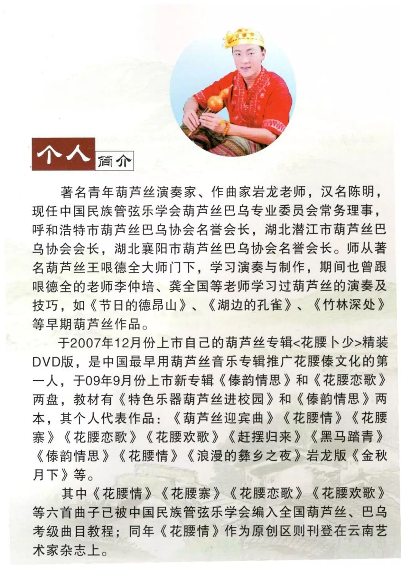 岩龙老师(汉名陈明)—著名青年葫芦丝演奏家、作曲家、教育家,师从著名葫芦丝王哏德全,现为中国葫芦丝巴乌专业委员会常务理事、湖北省潜江市葫芦丝巴乌协会会长、超十孔前驱推广人。