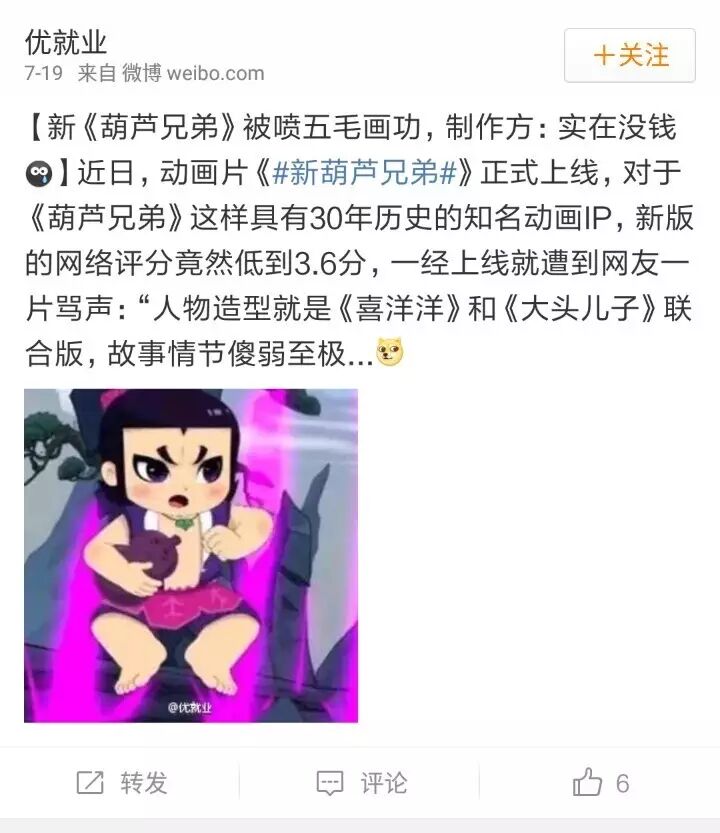 虽说由《葫芦兄弟》这样具有30年历史的知名动画IP改编的剧集《新葫芦兄弟》,可以借助观众对角色的熟悉度,省下一大笔宣传费,但是,因为许多观众对原版的“葫芦娃”早已形成了“刻板印象”,新版的“葫芦娃”在改编起来,也就更难满足观众的期待。