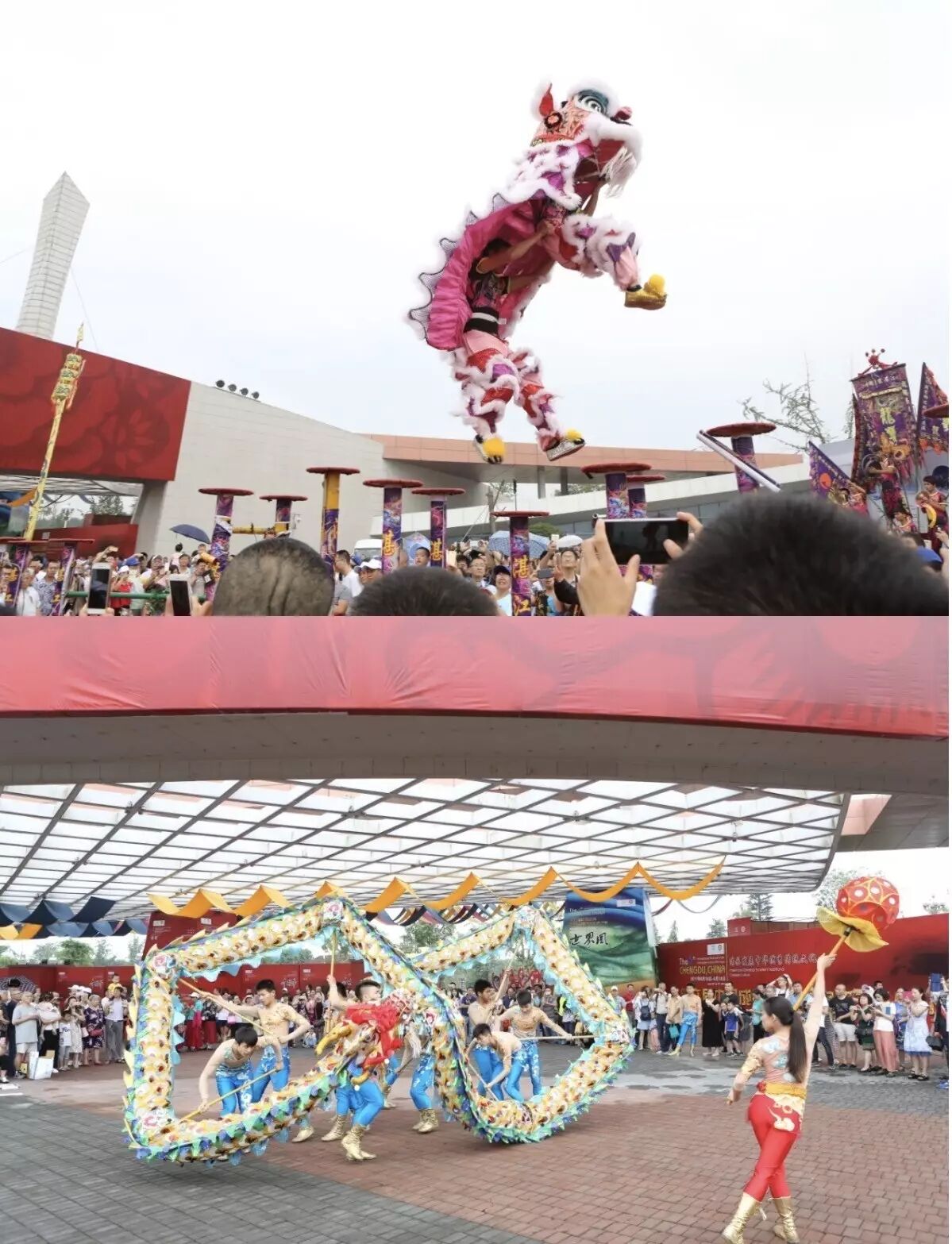 全国非遗演出就在这里进行。广东的舞狮师傅们技艺高超,在高高的台架上跳跃腾挪,不断给你来点“惊险”。春节龙灯表演大家都不稀奇,但是搭人体的“双层舞龙”你见过没有?必须好好的欣赏一盘!