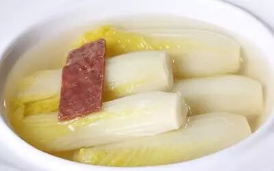 4、开水白菜不是白开水煮大白菜,其“开水”是用老母鸡、老母鸭、云南宣威火腿上的蹄子、排骨、干贝等鲜货精心熬制四个小时以上,取其汤,再用鸡腹肉打成茸,加入汤中,吸附汤中杂质而制成,而白菜只取大白菜中间那点发黄的嫩心。