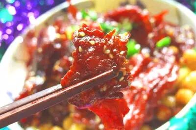 12、张飞牛肉,阆中市区名叫保宁镇,回汉杂居。老回民在逢年过节时会制作腌牛肉,人们在牛肉表面涂抹锅烟灰防腐。该牛肉最大的特点是表面呈墨黑色,切开后内部肉质却是棕红色,很是好看,后人因其面黑心红形似张飞而将其名为张飞牛肉,因此名字取得恰当,于是迅速被人们熟悉。