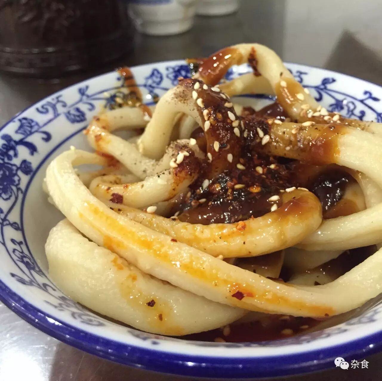 甜水面也是成都特有的小吃,一长条似小手指粗的擀面,韧劲十足,浸入由酱油、红糖、姜、葱、香料、辣椒油熬制、浓缩而成的蘸料中。辛辣、鲜香中带着甜,复杂多层次的味道,在一道小吃中体现得淋漓尽致。
