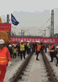 4名工人拿着红色鱼尾板上前,娴熟地将左右轨道连在一起。