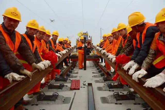 牵引车缓缓向前,30多名铁路工人围在两侧,分别扶住长轨,让它们无偏差地落在扣件中。