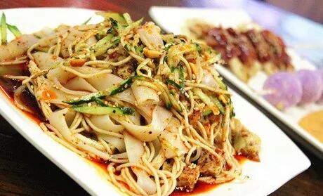 洁白的凉皮、金黄的面条、翠绿的黄瓜丝,加入盐、醋、调料水、面筋,最后淋上一勺特制的辣椒油,筋道爽滑、酸辣可口,令人垂涎。