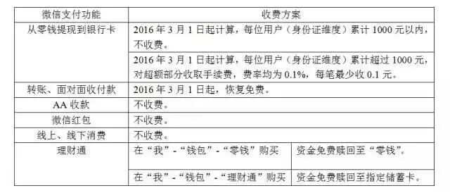 啥?春节抢的红包还没来得及存进卡里!2月15日,微信发布公告称,2016年3月1日起,微信支付调整手续费收费政策,转账交易恢复免费,对超额提现交易收取手续费。具体收费方案为,按提现金额的0.1%收取手续费,每笔至少收取0.1元,每位用户(身份证维度)终身享受1000元免费提现额度。细则如下:![]()