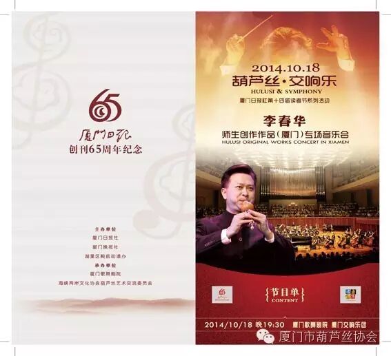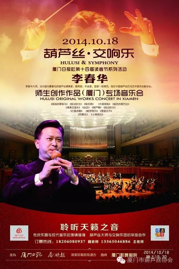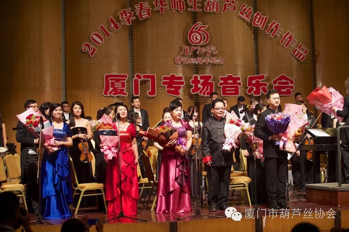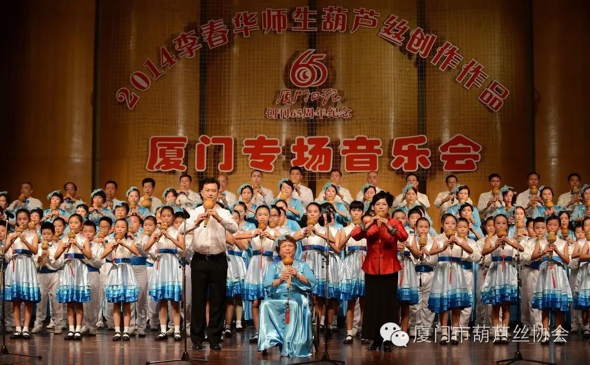 作为纪念厦门解放65周年和厦门日报第14届读者节系列活动的一个重要组成部分,“2014李春华师生葫芦丝创作作品(厦门)专场音乐会”于2014年10月18日晚在厦门市歌舞剧院隆重上演。中国葫芦丝巴乌艺术委员会副会长、著名中国葫芦丝演奏家、作曲家,国家一级演奏员、海峡两岸文化协会葫芦丝艺术交流委员会荣誉会长李春华携厦门的葫芦丝学生们联袂演出,同台献艺。这是中国葫芦丝艺术界的一次大观摩、大交流、大融汇。活动现场异常火爆、热烈,可容纳1200百人的厦门市歌舞剧院座无虚席,精彩的演奏为观众奉上一道绝佳的视听盛宴和文化大餐。