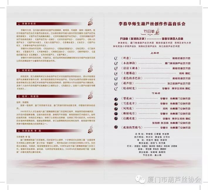 “2014李春华师生葫芦丝创作作品(厦门)专场音乐会”分为上下场进行。由李春华老师携120人分声部合奏的《鼓浪屿之波》,作为本次音乐会开场曲,拉开了音乐会的序幕。接着,厦门市葫芦丝爱好者们精心为音乐会来宾献上了上半场的演奏;下半场则由我国著名的葫芦丝演奏家、作曲家、国家一级演奏员,中国葫芦丝巴乌艺术委员会副会长、海峡两岸文化协会葫芦丝艺术交流委员会荣誉会长李春华为主,在厦门交响乐团的伴奏下演奏。音乐会不仅演奏李春华老师的创作的优秀葫芦丝曲目,同时,李春华老师的学生、厦门市葫芦丝协会会长郑宪创作的富有闽南音乐特色的葫芦丝曲《土楼那边》和《凤凰花》也在音乐会上亮相。