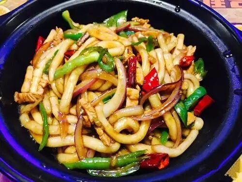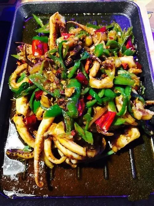 鱿鱼在锅里加油炸熟,加上青辣椒,红辣椒,和各种调料,这样做成的鱿鱼脆嫩爽口,香辣鲜美,红亮诱人,回味无穷。