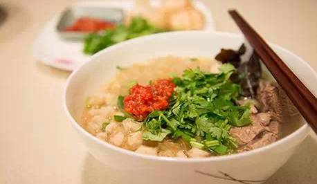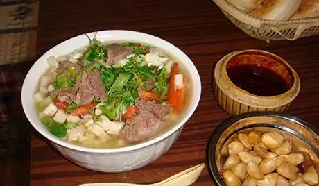 回坊斋牛羊肉泡馍据称是传承了百年的秘制配方,虽然具体配方不得而知,但无疑是用了羊骨老汤。所以汤汁稠糯,噙在口中似有不同于流质的错觉,可谓满颊生香。因为味正汤浓,所以此家提供的高汤也别具风味,食客一般都会要上不止一碗。食材的分量和质量也算上乘,酱辣片和糖蒜也是用心调制的,能看出精细;泡馍的色泽光亮,冬吃暖胃耐饥、夏吃发汗醒神,捞完干货会忍不住喝光汤渣。