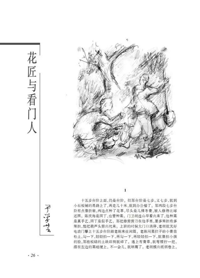 十五步台阶上面,仍是台阶。但那台阶是七步,又七步,就到小石板铺的甬路上了,再走几十米,就到办公楼了。那两段七步台阶有点像折扇,两边点种了花草,尽头是几棵冬青,被人修得比球还圆。陈庆海是园丁,也管种菜。门卫胡连山早看出来了,他种菜是真手艺,园丁是假手艺。那把修剪剪刀在他手里,要多笨拙有多笨拙,能把葫芦头剪出坑来。上班的时候大门口消停,老胡就关好电动门攀上十五步台阶跟老陈来扯闲篇。老陈用菜拉子给小青苗松土,勾一下,轻轻拍一下,再勾一下,再轻轻拍一下,就像拍小孩的脸,那些板结的土块即刻就碎了。遇上有青草,就弯腰拧一把,搭在左边的菜畦埂上,不一会儿,就晒蔫了。老胡摸出纸烟卷上,问老陈抽不,我这可是自家园子种的,描了豆饼当肥料。老陈拉完一畦,在裤子上拍拍手,过来接老胡的卷烟。上面有老胡的口水味,可这有什么要紧呢?豆饼做肥料描出的烟苗,是一股另类的香气。乡间已经看不见自己种烟的了。