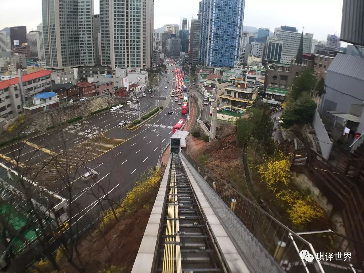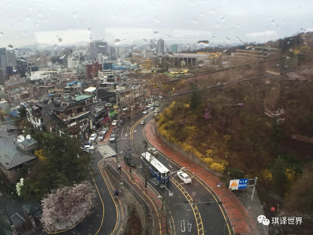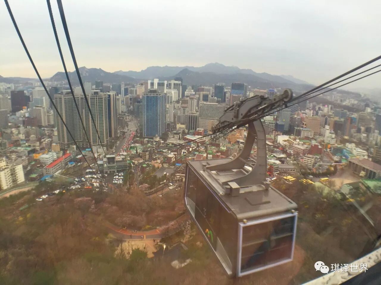 * 首尔塔缆车,这是从缆车里拍出去的风景,到南山顶的缆车费用是单程6000韩元/人,往返8500韩元/人。