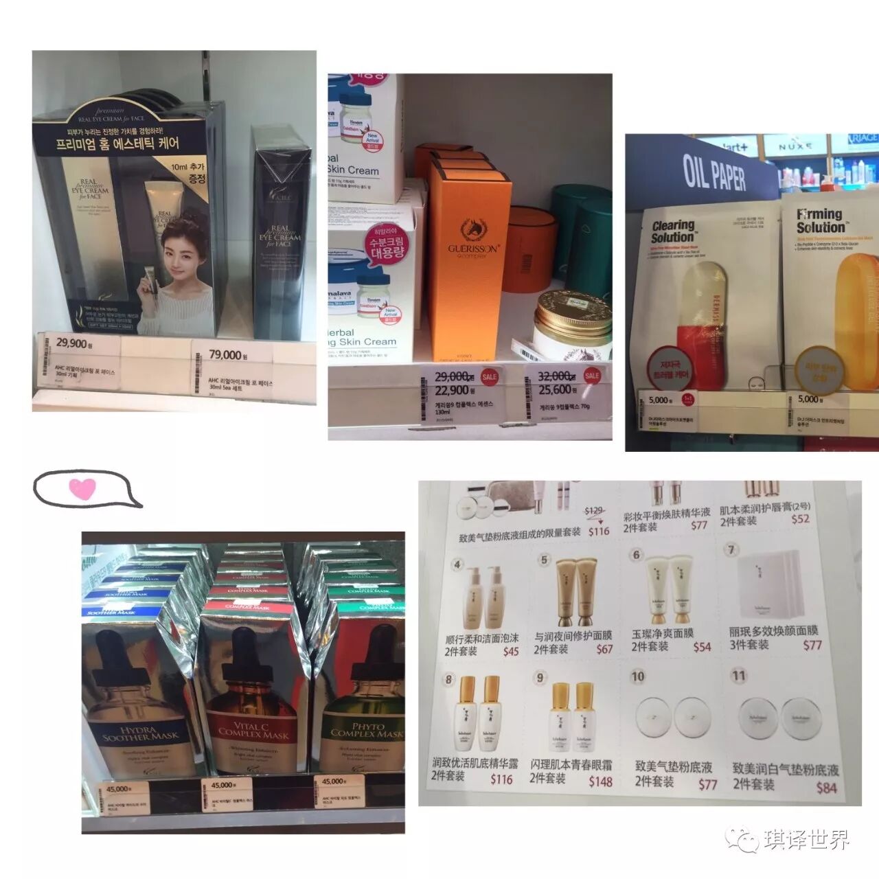 由于这方面我不太懂行,都是别人推荐什么就买什么,比如雪花秀润燥精华、兰芝隔离霜、Whoo洗面奶、面膜有It's Skin、AHC、Clinie、Dr.jart+等,由于难得来一次,这些我基本上都买了。给大家一些价格参考吧,都是当初在店里拍的历史图片,不一定是现在的价格↓