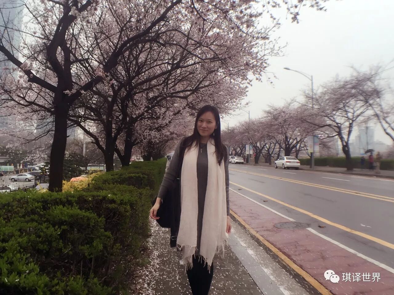 * 汝矣岛,汉江上的一个小岛,也是一个金融中心,路两旁都种满了樱花,粉嫩粉嫩的,只不过天气一般般,如果是蓝天白云就更漂亮了,不过我们也是顺便来参观KBS电视台的,不算白跑一趟。