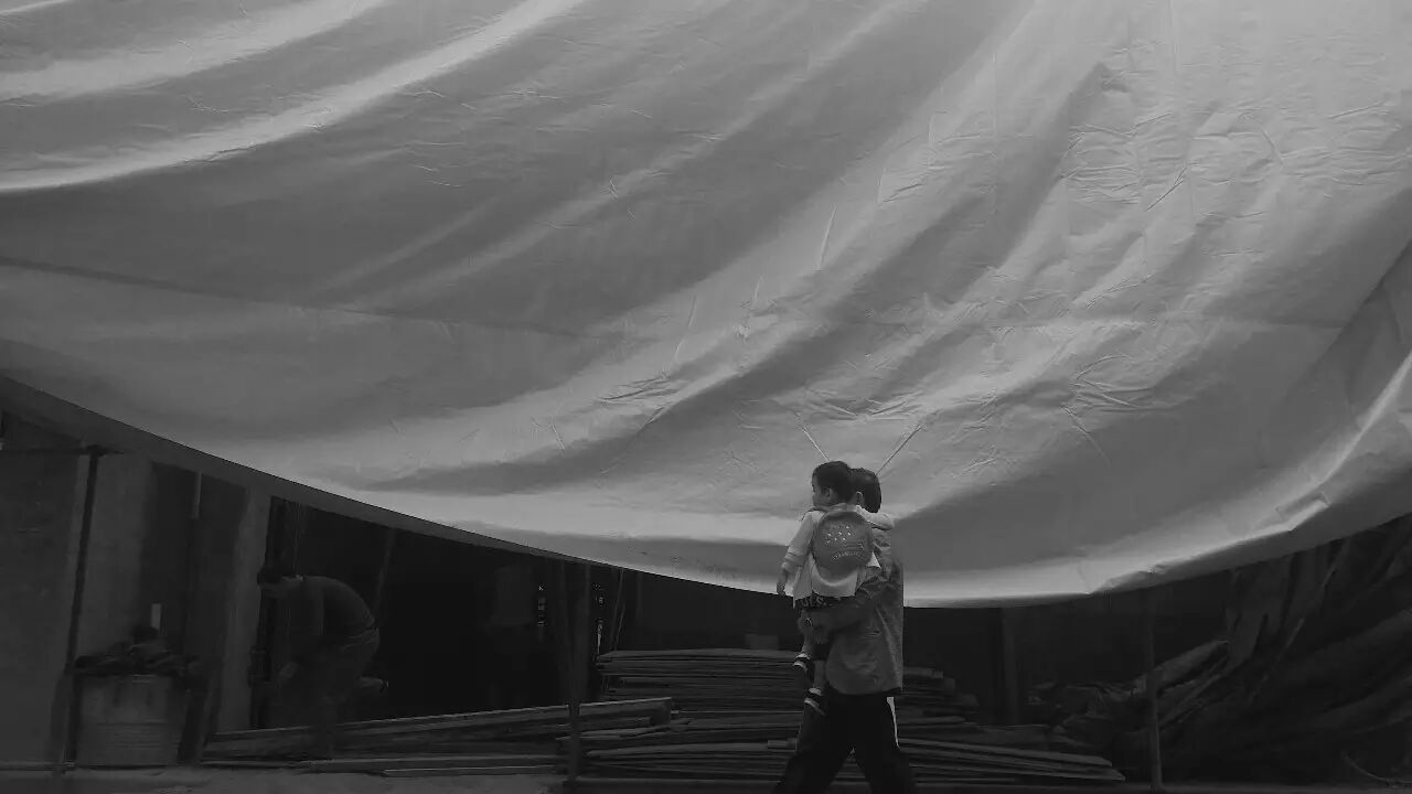 一片工地垂下的塑料布旁,父亲抱着女儿走过时,默契地加快了速度。