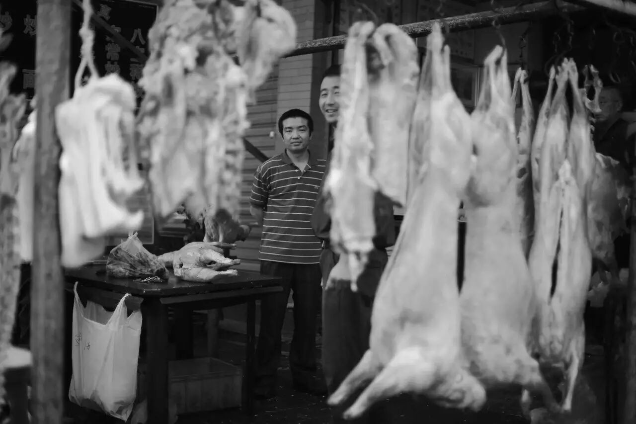 成片整齐的猪牛羊,这样的生鲜铺子在回民街附近的巷子三五步就能遇到一个。