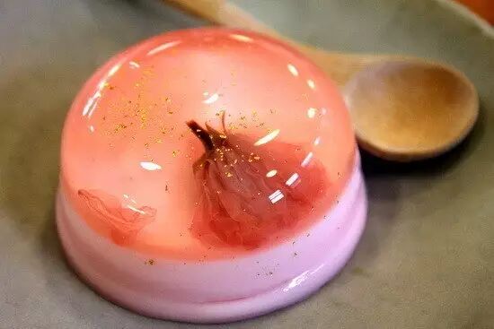 有一整朵樱花在里面,透过透明的果冻看,非常漂亮,精致得都不舍得吃啦!樱花树下装饰着精致剔透的果冻,无论是观赏者还是被观赏者,都深深的坠入樱花般的美梦,樱花瓣的剔透与美味,果冻制作成功之后晶莹剔透的样子,让人忍不住想要咬一口,十分浪漫优雅。