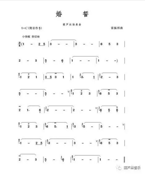 《婚誓》是电影《芦笙恋歌》的主题曲,由雷振邦作曲,此首乐曲运用云南少数民族音乐体裁,旋律婉转抒情,意味深浓,虽然乐曲短小,结构简单,却是葫芦丝乐曲的一首经典名曲,