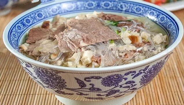 掰好交给师父,师傅根据你选的肥瘦状况将羊肉切好,码在碗中,然后在肉汤之中泖热。