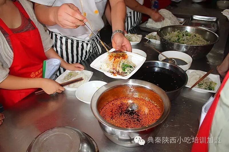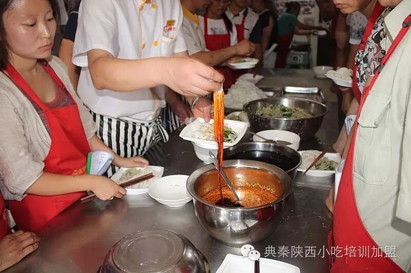 西安典秦陕西小吃培训学校的郭师傅在教学生如何去调凉皮!大家都等着郭师傅去调凉皮,争先恐后的等着去吃。