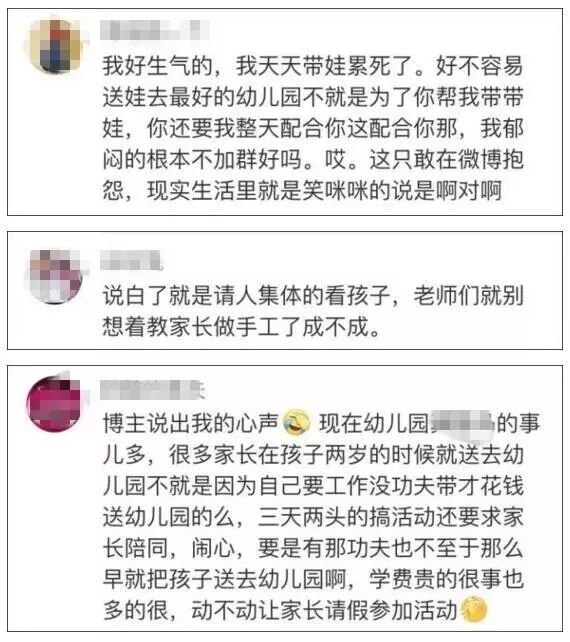 其实,对于陪伴孩子成长,相信大多数家长也是赞成的,但一些幼儿园周周有活动,是个节都要过,或者每次活动布置的任务太难,孩子难以完成最后还是家长动手,这些不合理之处让上班族家长分身乏术,倍感心累。