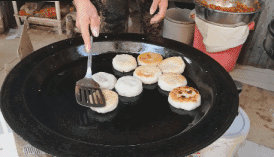 冷却后可以倒上少许的油,在锅里加热煎熟,团子外面一层蹦脆蹦脆的,而里面的各种香料也会随着团子加热,香气扑鼻而来。