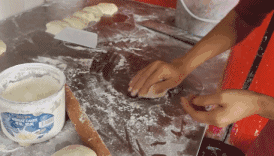 石首街道上的锅块就不一样了,将醒好的面团三下两下,抻宽拉长